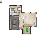 A l'étage, une grande mezzanine de 18 m² surplombe l'espace de vie grâce au vide sur séjour. L'étage se compose également de deux chambres, une deuxième grande salle de jeu, une salle de bain et WC séparés.